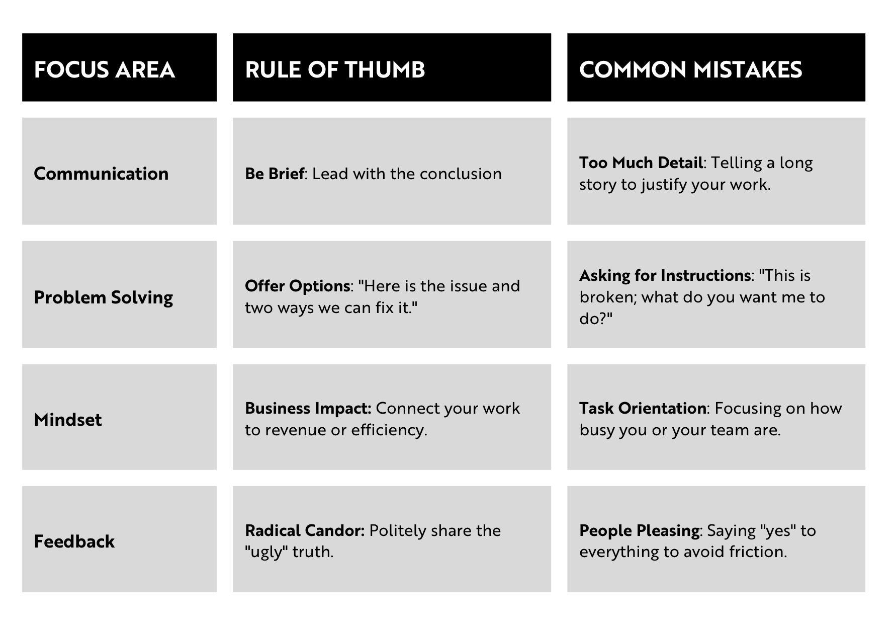 And, like most of the overachievers I know, Sammy made a screenshottable chart to highlight how best to communicate, problem solve, and give feedback like an executive. I found the common mistakes column particularly useful.