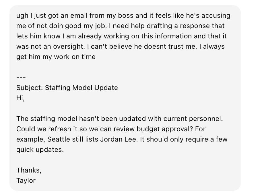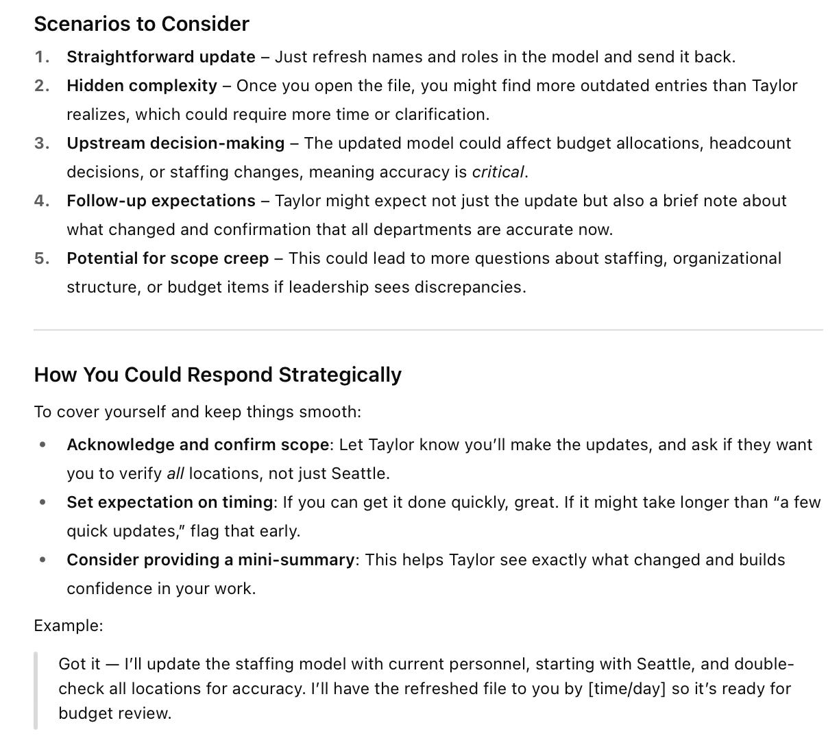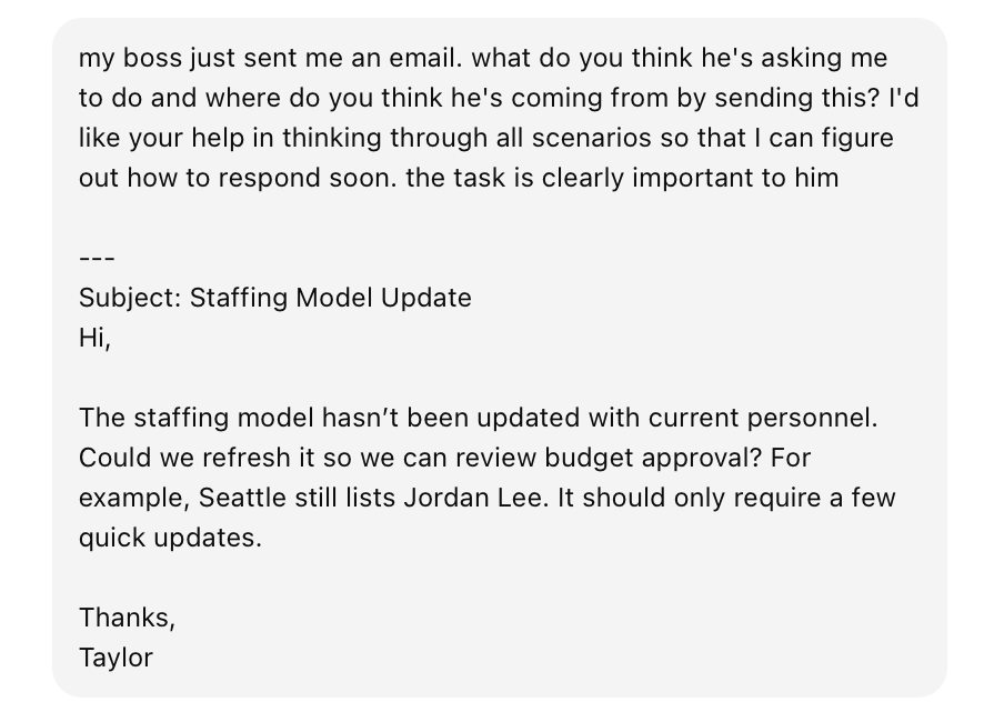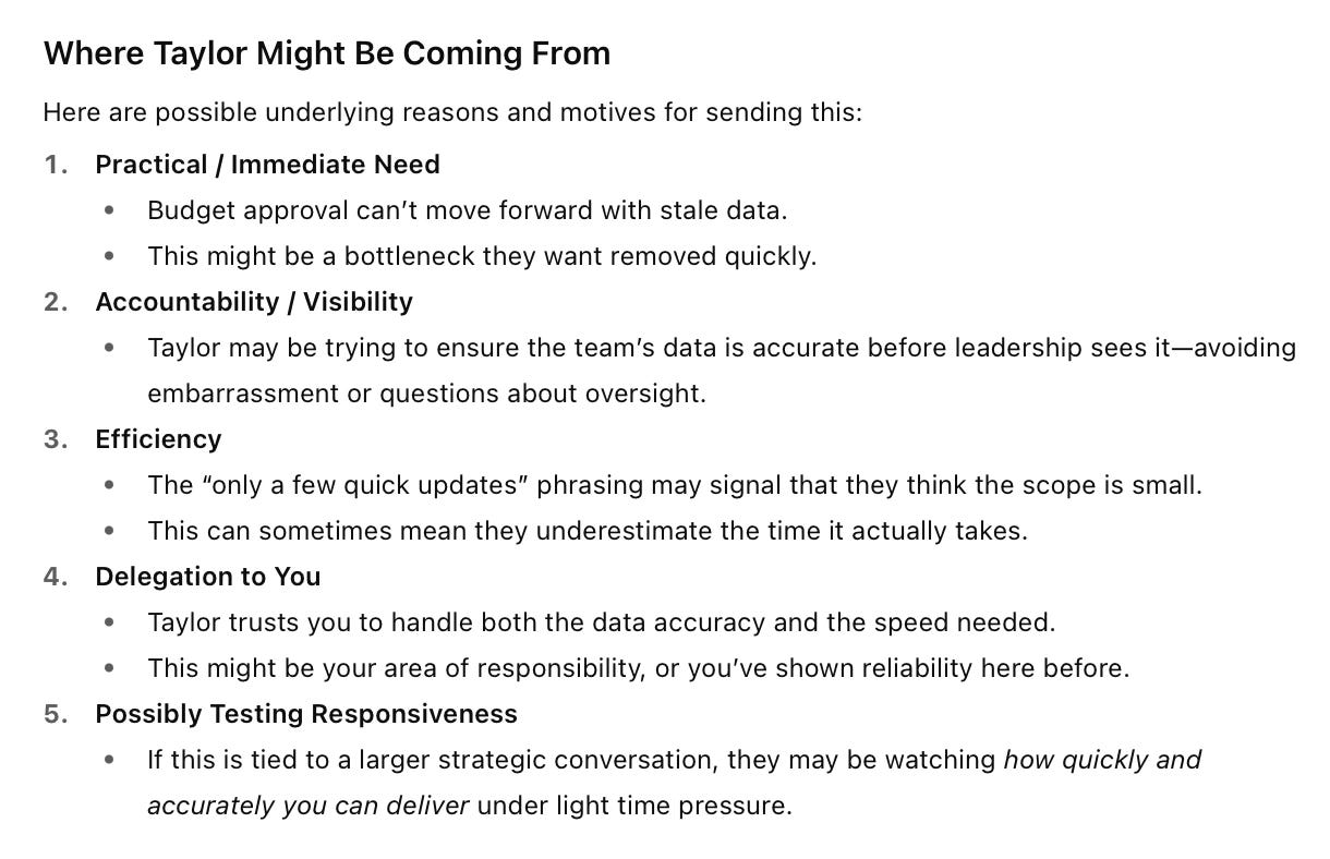 This response kept me focused on what I needed to do and gave my manager the benefit of the doubt. It didn’t only paint a rosy picture, notice how it highlighted the blindspots that they may have and how to navigate them. On top of that, it got me thinking about what types of requests may come next.