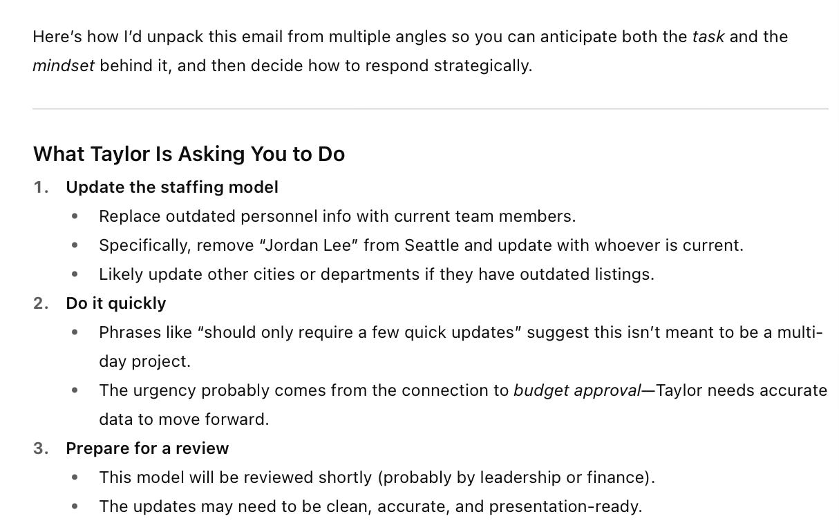 It helped me understand where my manager might be coming from and what their priorities may be based on what was written in the email.