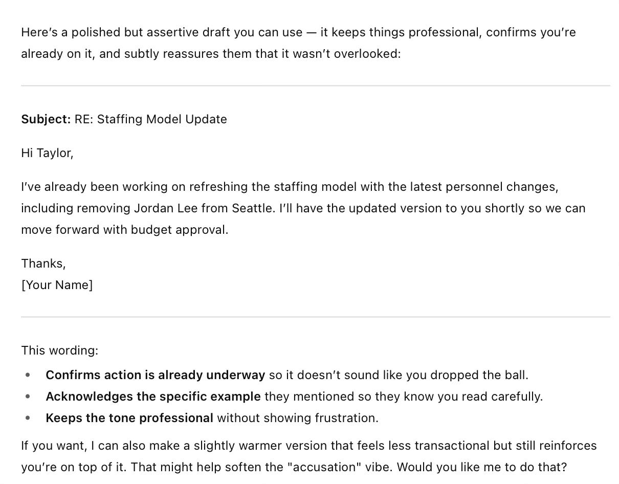 ChatGPT took my assertions as fact and drafted an email based on those assumptions. As a result, I delegated my thinking, emotional regulation, and reasoning to a tool. IMO this type of use does not help you excel long term at work. It didn’t ask me a single question or try to help me explore alternatives but to be fair — it did offer to draft a warmer version at the very end of its recommendation. The goal was still to defend myself.