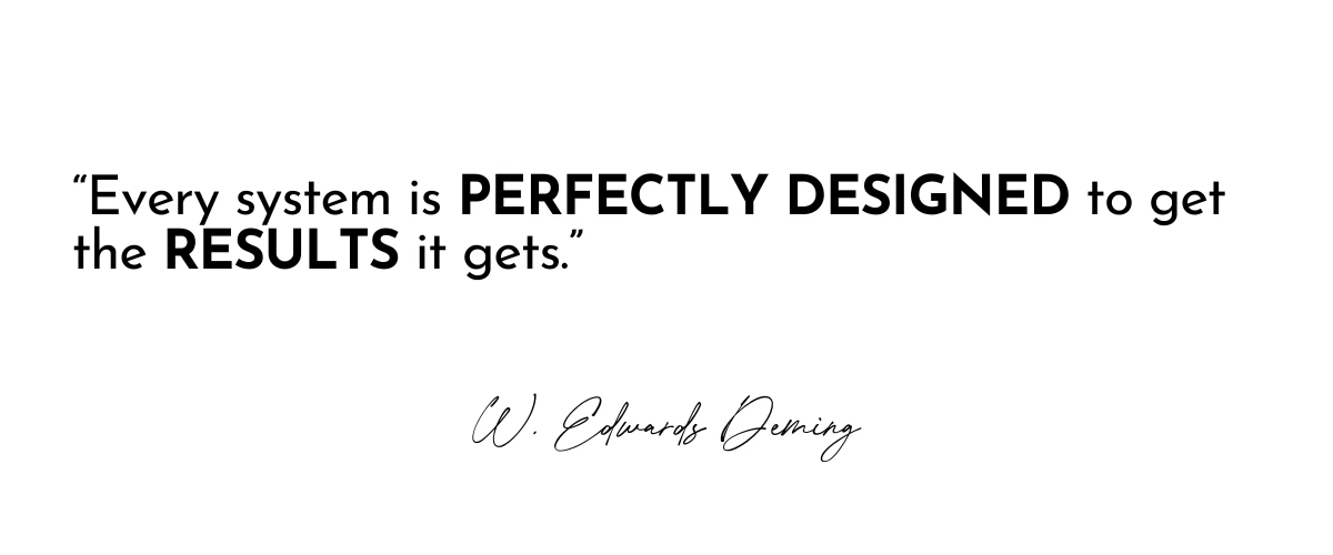 Let’s unpack this quote. Deming makes it clear that systems are necessary for achieving results; we can assume that good systems yield good results and, relatedly, bad systems yield bad results.
